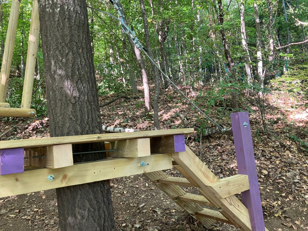 Am construit 3 tiroliene paralele de 50m fiecare și am furnizat 8 echipamente de autoasigurare copii si 10 echipamente autoasigurare adulti. Tirolienele folosesc sistemul de asigurare linia vieții continue.