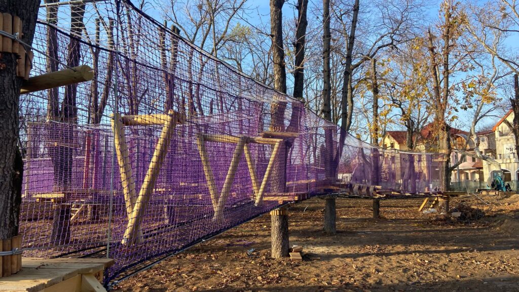 Proiectare, construcție elemente parc aventura, tiroliene, sistem de asigurare plasă de asigurare